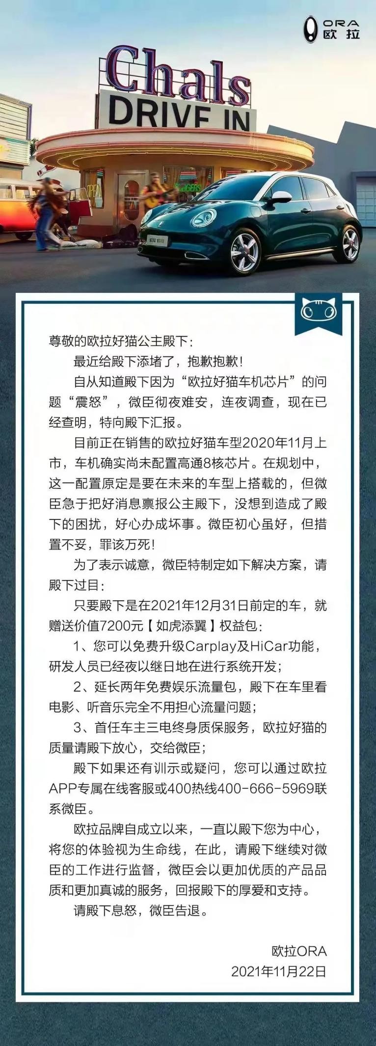在事件持续的发酵后,欧拉官方在11月22日发表声明称之前所宣传的高通八核芯片,是准备在未来的车型中使用的。