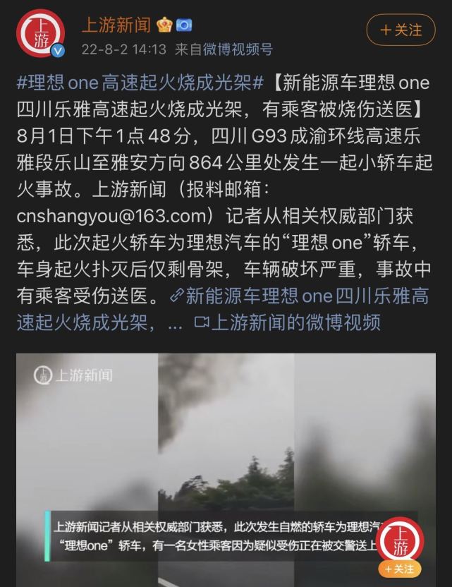 据媒体报道,8月1日下午,在四川G93成渝环线高速乐雅段乐山至雅安方向发生了一起车辆自燃事故,起火的车辆为理想ONE。