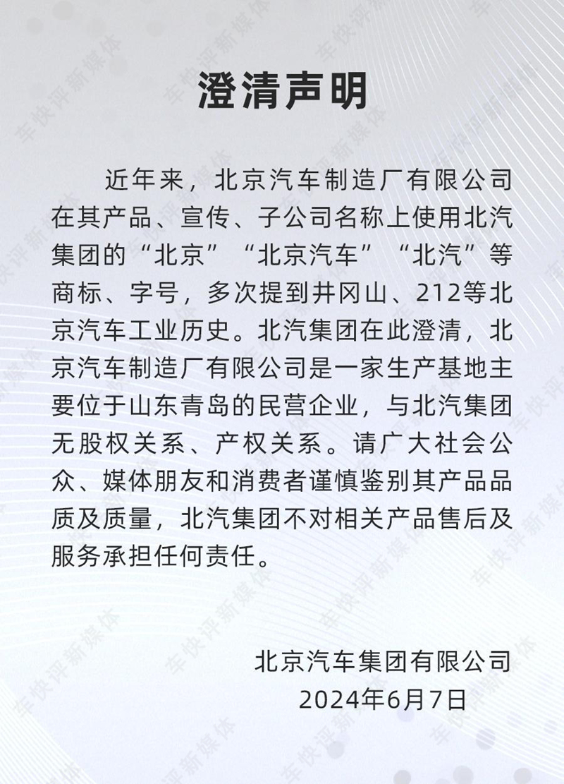 在声明中北汽集团称北京汽车制造厂在产品宣传和子公司名称上使用北汽集团的“北京”、“北京汽车”、“北汽”等商标字号,特别澄清北京汽车制造厂是山东青岛的民营企业,与北汽集团无权属关系和产权关系,请广大社会公众、媒体和消费者谨慎甄别其产品品质及质量。